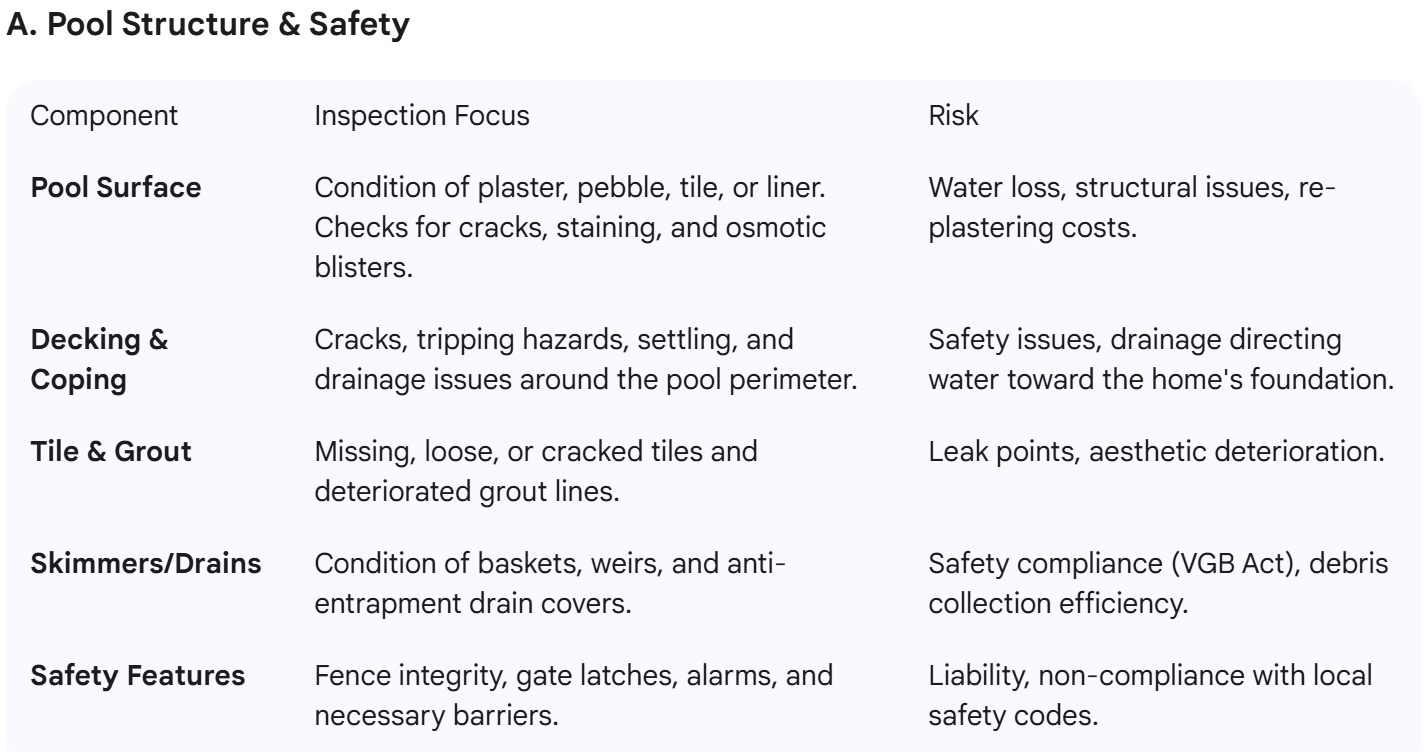 Our certified technicians follow a rigorous checklist to evaluate the complete health and functionality of the pool system. We inspect both the Pool Structure and all associated Equipment and Plumbing.